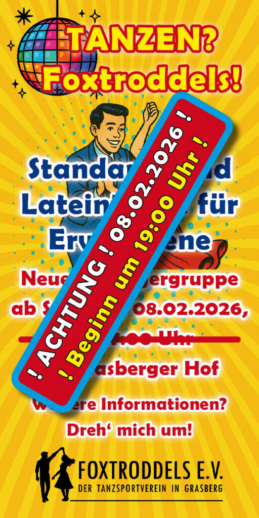 Am Sonntag, 08.02.2026, beginnen wir mit einer neuen Anfängergruppe auf dem großen Saal des Grasberger Hofs. Unter Anleitung unseres Tanzlehrers Knuth Gerwien und seiner Tanzpartnerin Irene Thimm lernen wir Standard- und Lateintänze, wie z.B. Walzer, Discofox, Quickstep, Cha-Cha-Cha,Rumba, Jive uvm. Kommt gerne vorbei und schnuppert unverbindlich und kostenlos hinein. Bittet meldet euch zuvor bei uns (vorstand@foxtroddels.de und 04208-8286782). Wir freuen uns auf euch! Weitere Infos findet ihr hier.